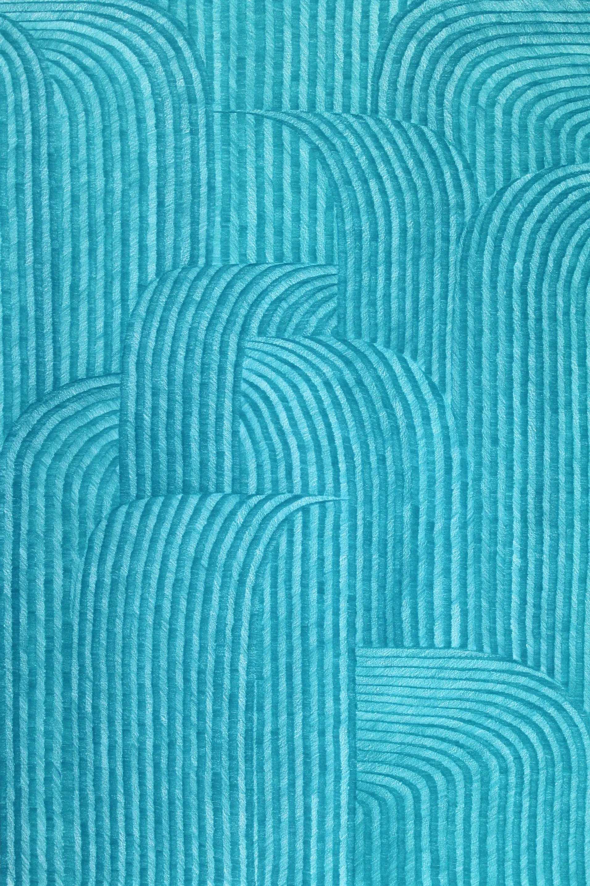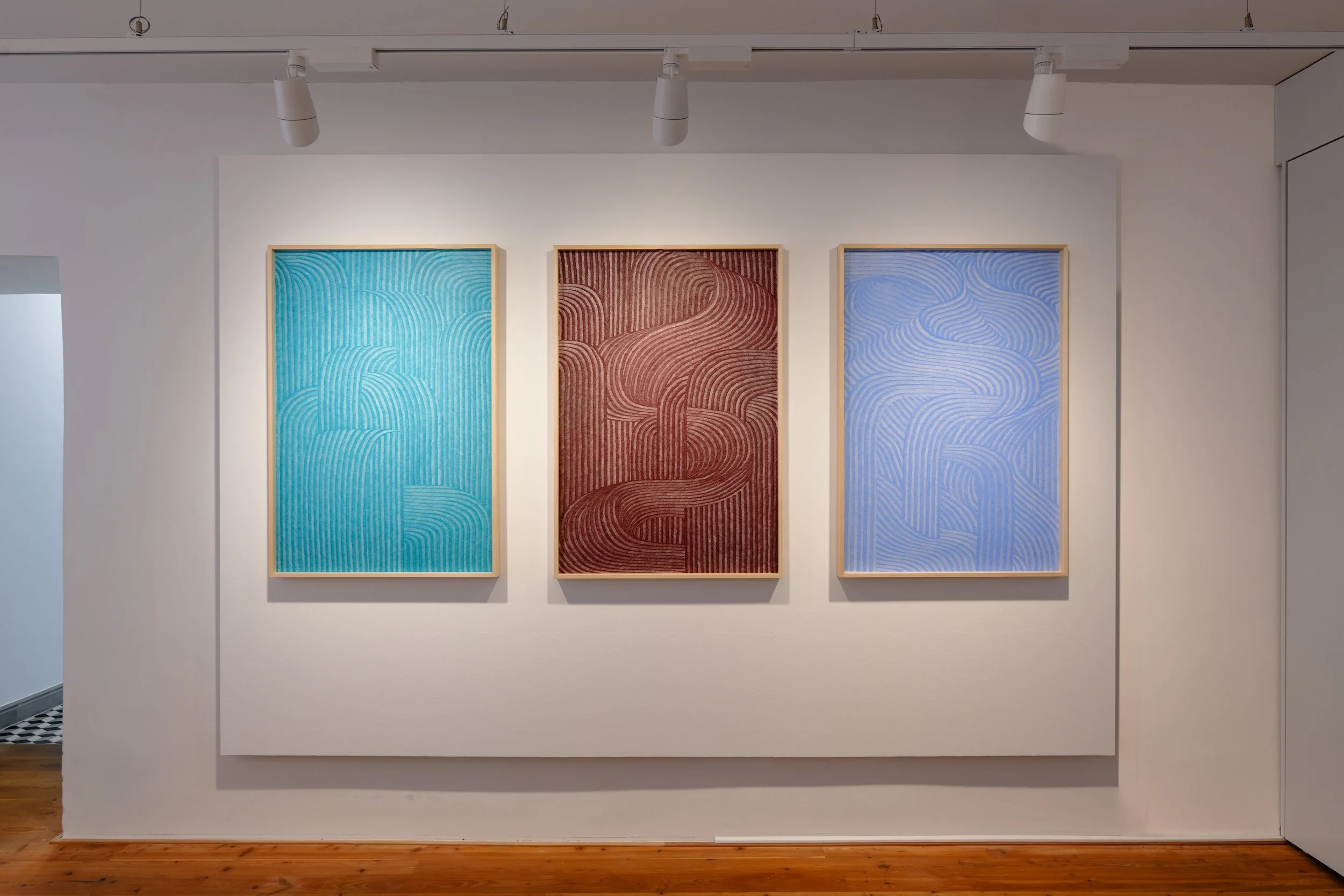 Les dessins grand format issus de la série Waterfall (2024), présentés sur les parois de la salle, puisent en partie leur inspiration dans la représentation délicate de l’eau en mouvement par certains peintres traditionnels asiatiques. Évoquant des entrelacs, les cinq travaux réalisés au crayon renvoient également à l’esthétique art déco qui fascine l’artiste. Ces œuvres monochromatiques inspirées par la contemplation du monde minéral et aquatique sont déclinées en différentes couleurs, dénuées de tout symbolisme. Pour les réaliser, Gaël Epiney se laisse guider : l’unique étape préparatoire réside dans quelques lignes esquissées pour figurer le mouvement de l’eau et les cascades. À partir de cette ébauche, l’artiste construit son dessin de manière méthodique, observant son évolution tout en laissant son instinct dicter les prochaines étapes. Ainsi, les formes et volumes apparaissent progressivement et s’organisent de manière organique sur le papier. Cette approche à la fois rigoureuse et spontanée est caractéristique de la démarche du plasticien.